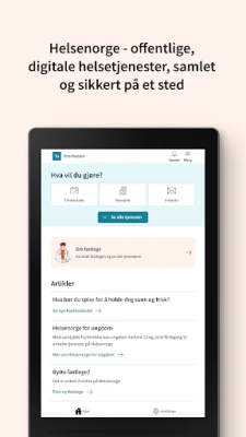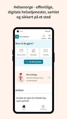 Helsenorge gir deg enklere og raskere tilgang til din helseinformasjon og en rekke offentlige tjenester. Logg inn trygt med personlig kode, ansiktsgjenkjenning eller fingeravtrykk. Få oversikt over nye meldinger, timebestillinger, e-konsultasjoner og forny resepter. Hjelper deg å følge opp egen helse og dine nærmeste.