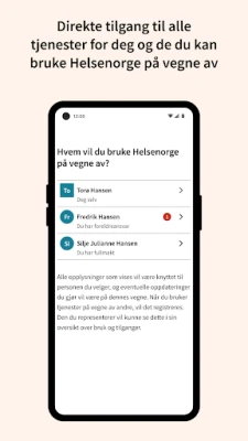 Enten du er i et behandlingsforløp, ivaretar en pårørende, eller fokuserer på forebygging for å opprettholde god helse, tilbyr Helsenorge skreddersydde løsninger. Ved å akseptere brukervilkårene får du tilgang til en rekke selvbetjeningsløsninger. Kommuniser direkte med ulike behandlere, og få fullt innsyn i egen helseinformasjon, samt detaljer om dine barn og andre du representerer via fullmakt, trygt samlet på ett sted.