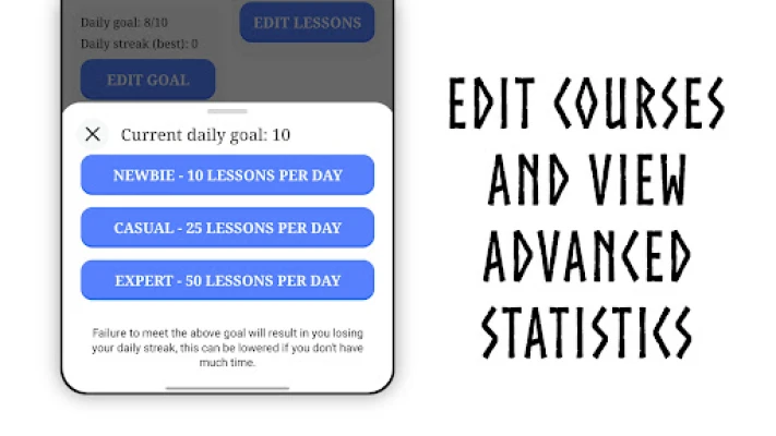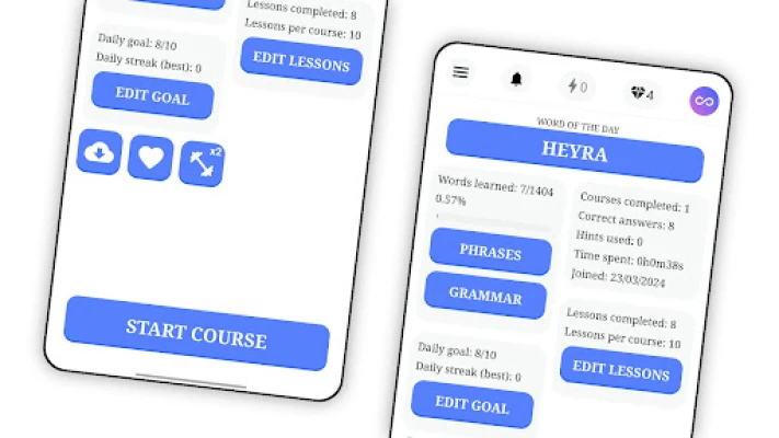Skap en varig læringsrutine med et system bygget for din suksess. Sett individuelle daglige mål, og Learn Old Norse+ holder deg motivert med varsler som bidrar til å bevare din oppnådde progresjonsrekke. Forbedre ordforrådet og grammatikken effektivt ved å aktivt korrigere feil gjennom repeterende øvelser. For dypere memorisering kan du velge å skrive inn ordene manuelt; denne metoden forsterker stavekunnskapen dramatisk, og hvert ord kan utforskes ytterligere med et enkelt trykk (krever nettforbindelse). Engasjer deg i gamifisering ved å tjene edelstener – et bevis på din fremgang – som kan veksles inn i ekstra hjerter for uavbrutt læring. Dessuten gir muntlig uttale-støtte deg mulighet til å finpusse lytteferdighetene ved å utfordre deg selv med ord og fraser før du avslører løsningen.