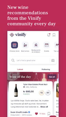 Ikke bare en digital vinkjeller, Vinify er også din personlige sommelier og et sosialt knutepunkt. Utforsk et kuratert utvalg av de høyest rangerte vinene som for øyeblikket er tilgjengelige hos ditt lokale Vinmonopol. Engasjer deg i et fellesskap av vinentusiaster; del dine egne unike smaksnotater, anbefalinger, og bygg opp en profil ved å følge andre med lignende preferanser. Utvid din horisont og la deg inspirere av hva andre oppdager i vinens verden.