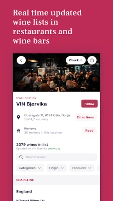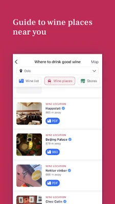 Vinify strekker seg utover hjemmekjelleren ved å koble deg til den dynamiske restaurantscenen. Flere anerkjente spisesteder benytter Vinify for å presentere sine vinkart, slik at du kan bla gjennom deres utvalg før du bestiller bord. Dette gir en unik mulighet til å planlegge din kulinariske opplevelse ned til minste detalj. I tillegg, for enhver vin du er nysgjerrig på, viser appen deg umiddelbart hvilke restauranter som fører den, og hvorvidt den er på lager hos Vinmonopolet, og sikrer at du alltid er informert om tilgjengelighet.